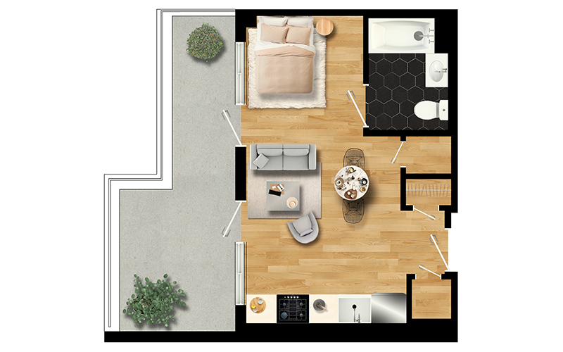 FIND YOURSRheingold’s Deluxe studios come with extra square footage and the Premium studios have a bonus room that can be used as a home office. All units have excellent storage and many feature balconies or terraces to extend your living space outdoors.