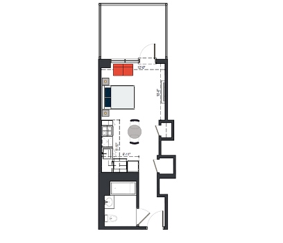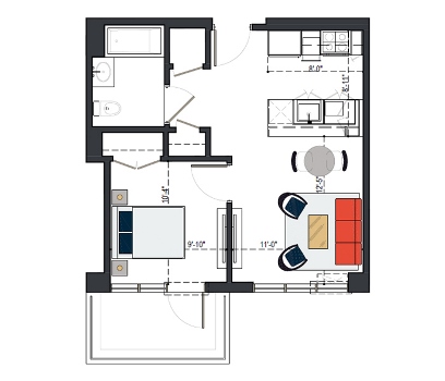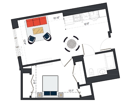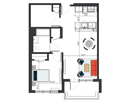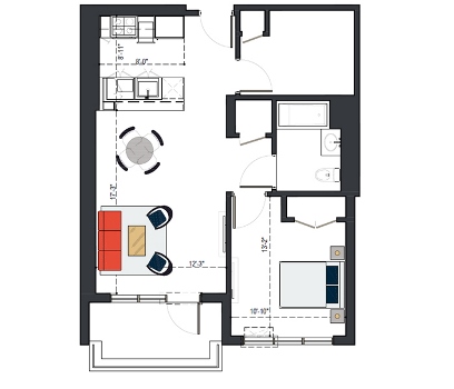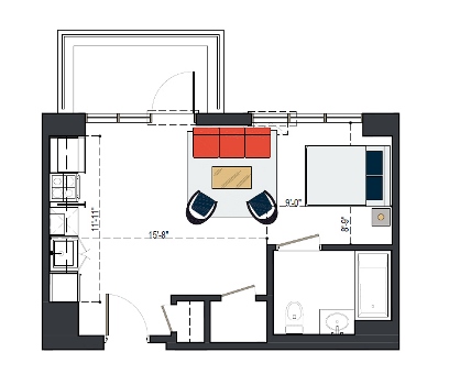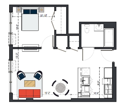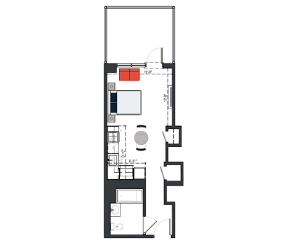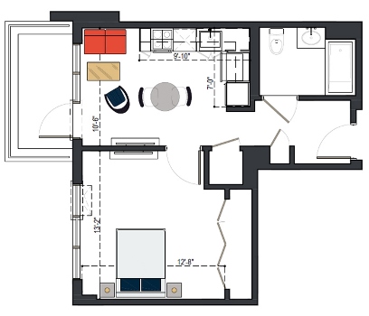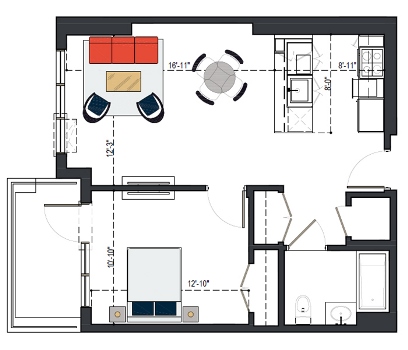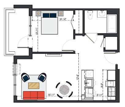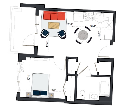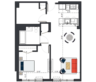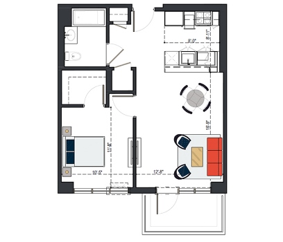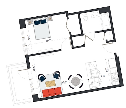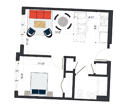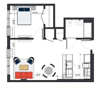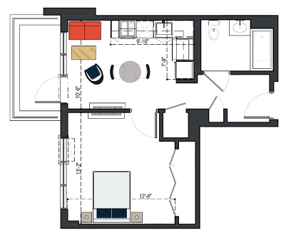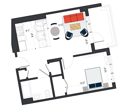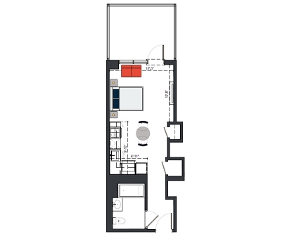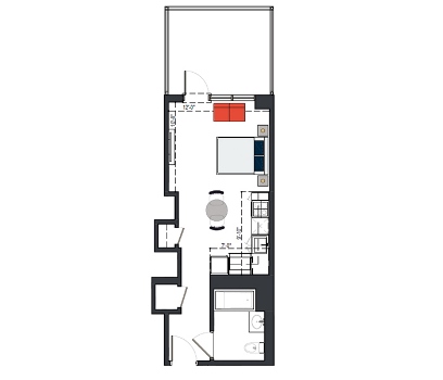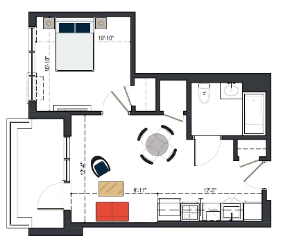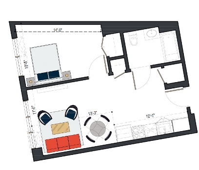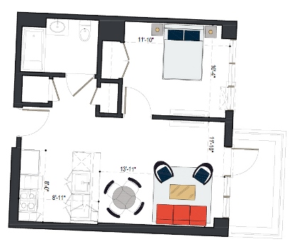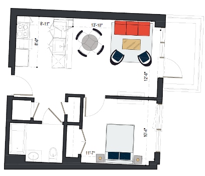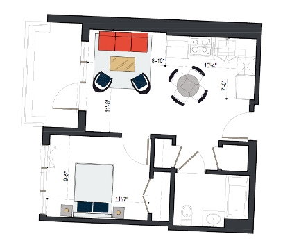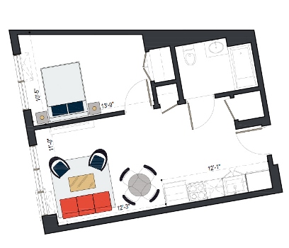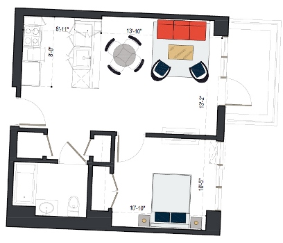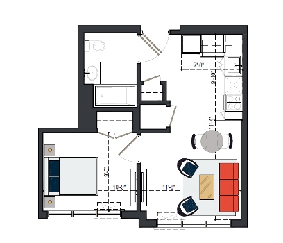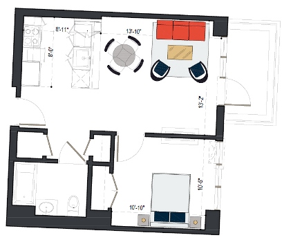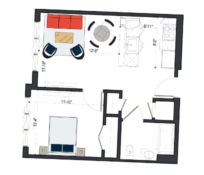8th Floor, 1 Bed, 569 SF