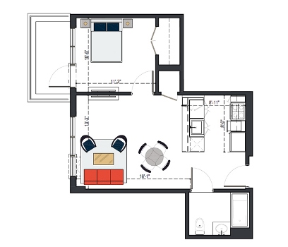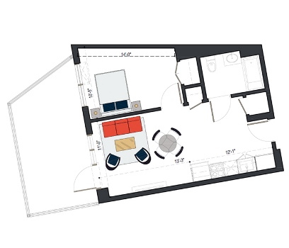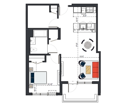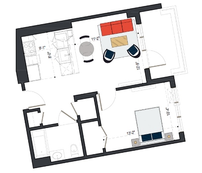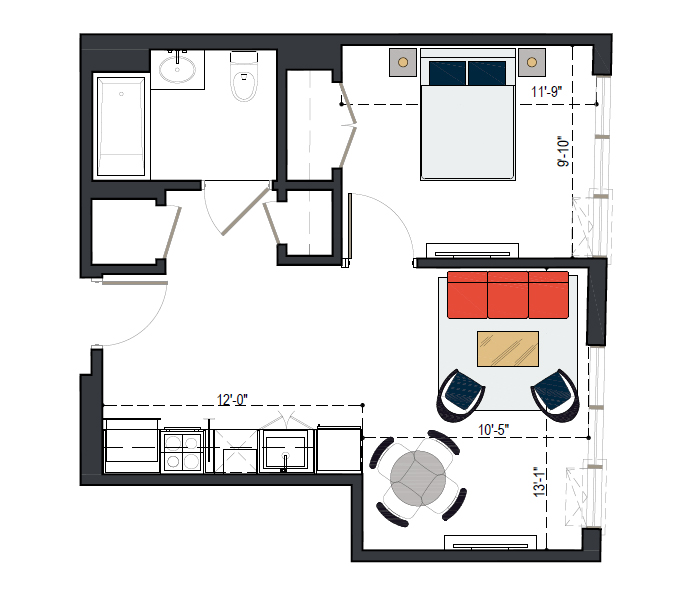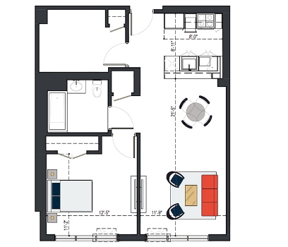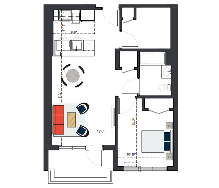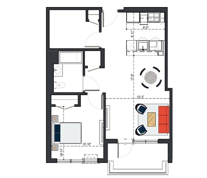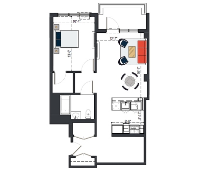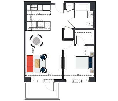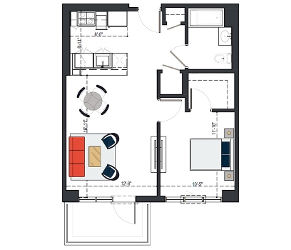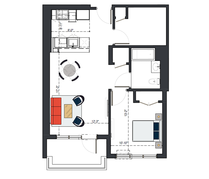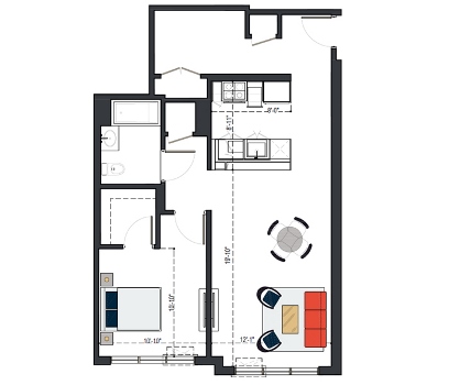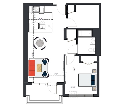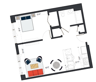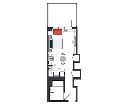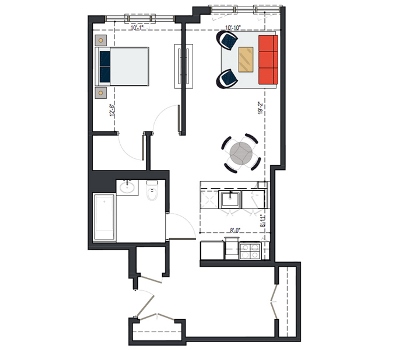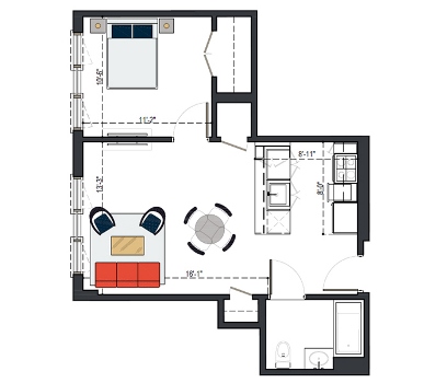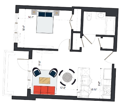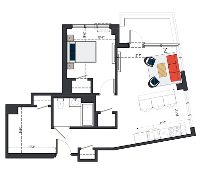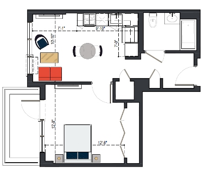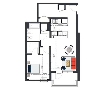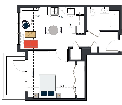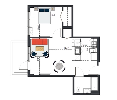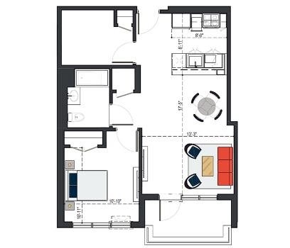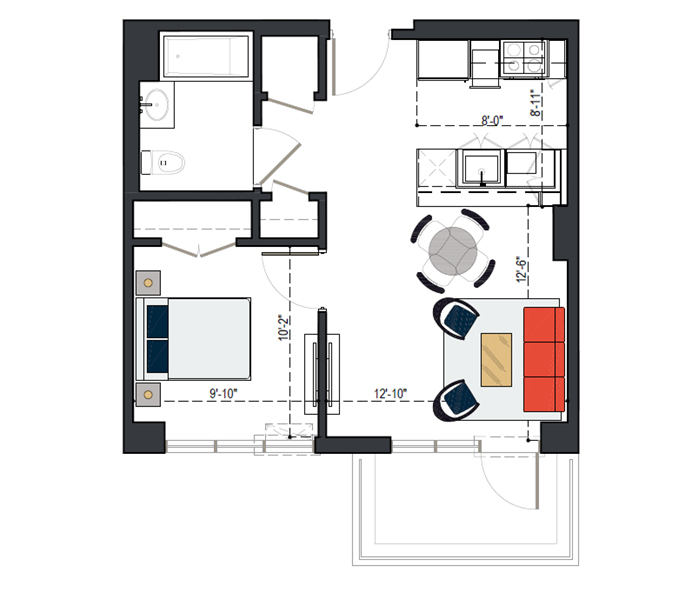 8th Floor, 1 Bed, 569 SF