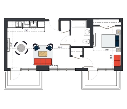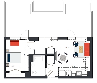 First Floor, 1 Bed, 549 SF