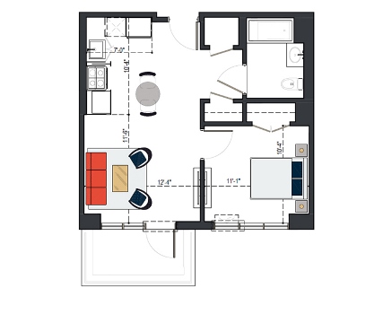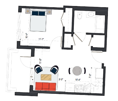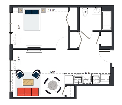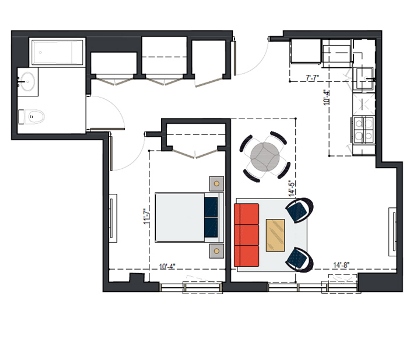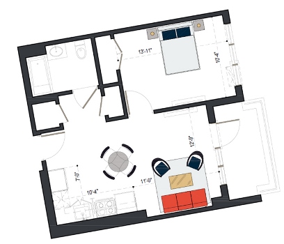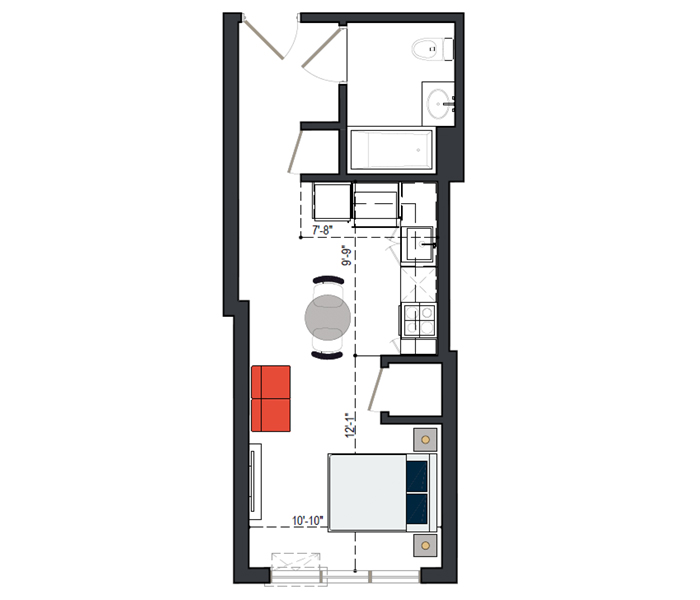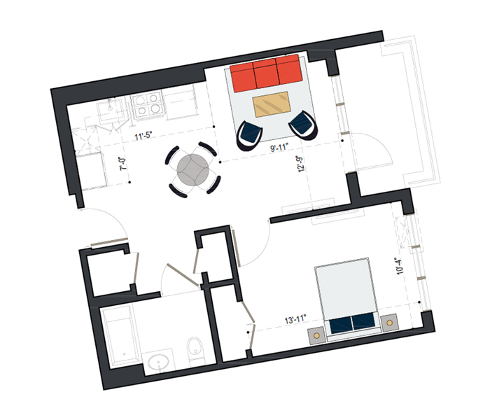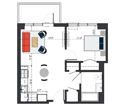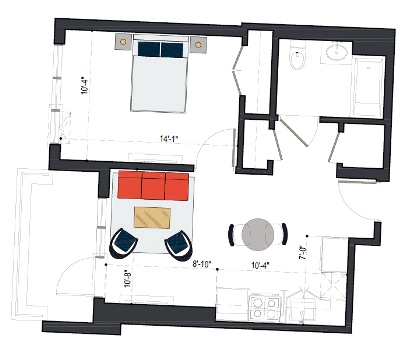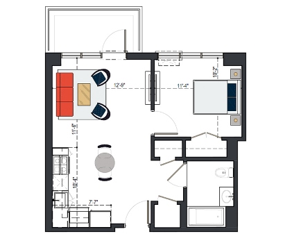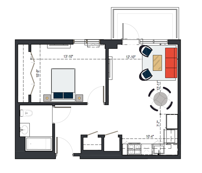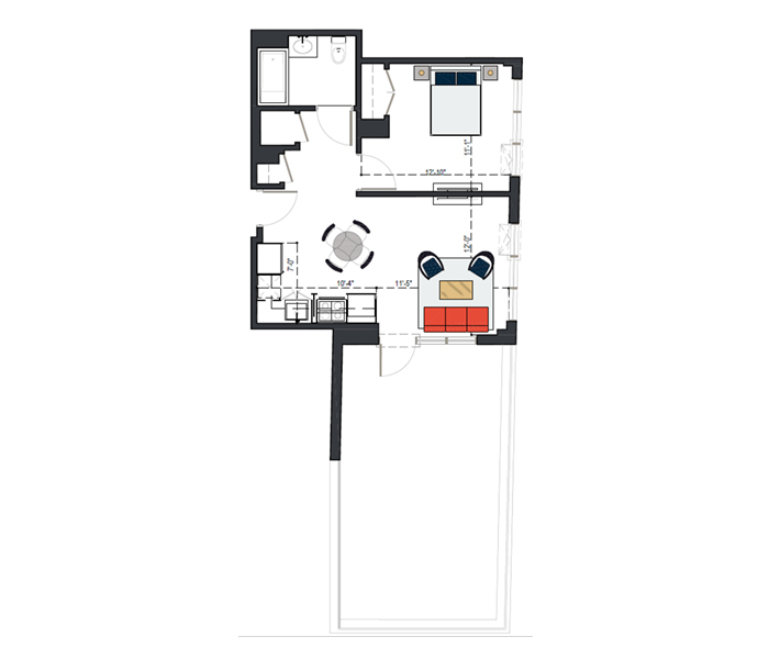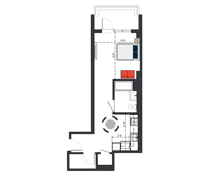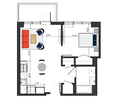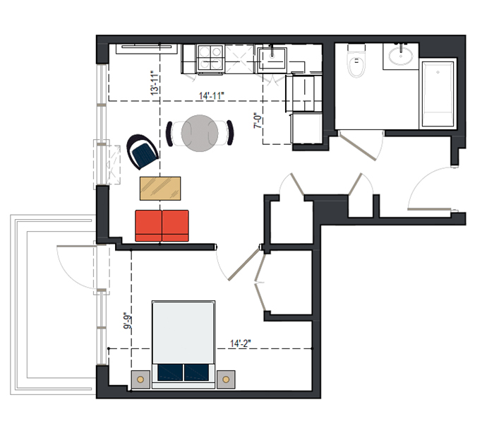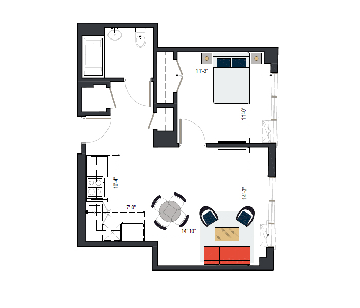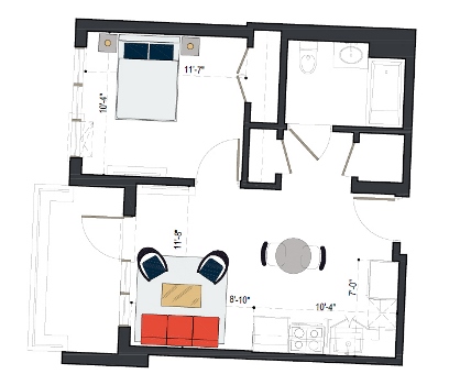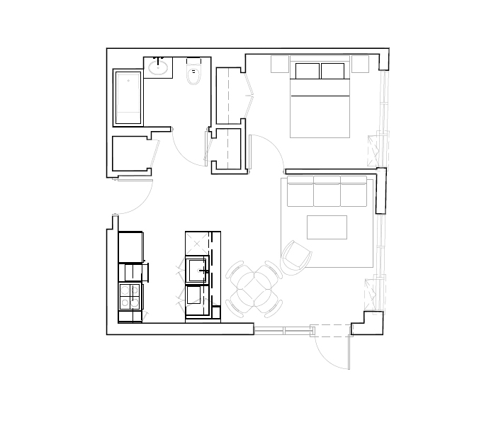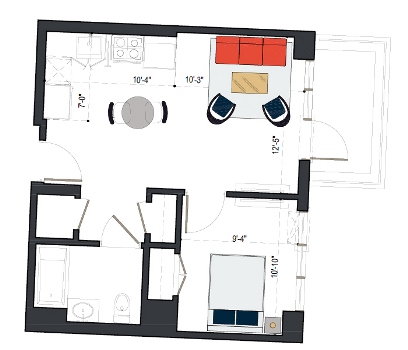 7th Floor, 1 Bed, 545 SF