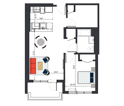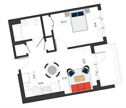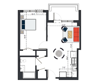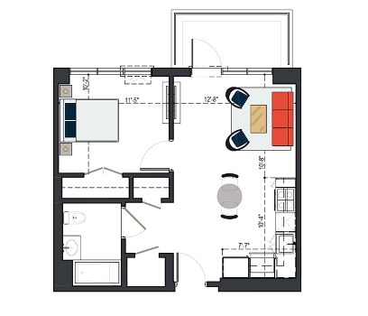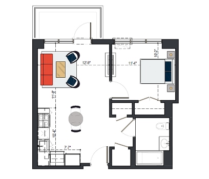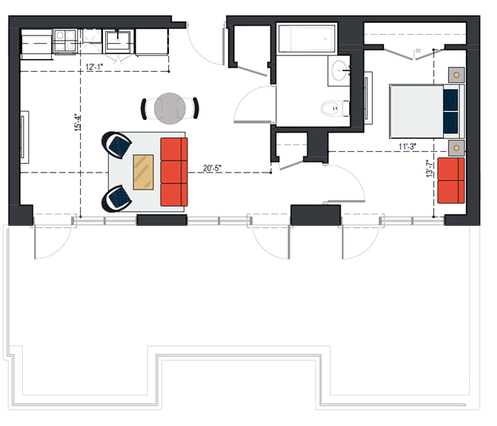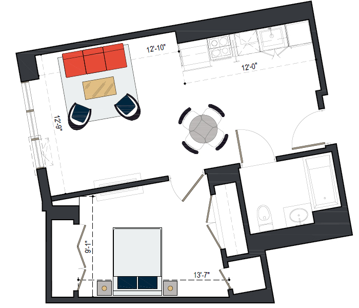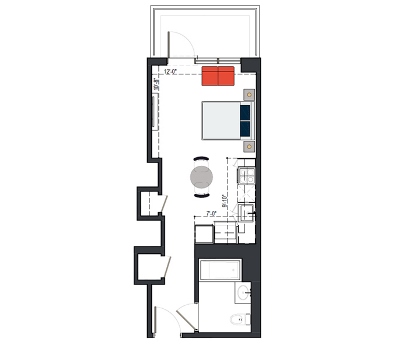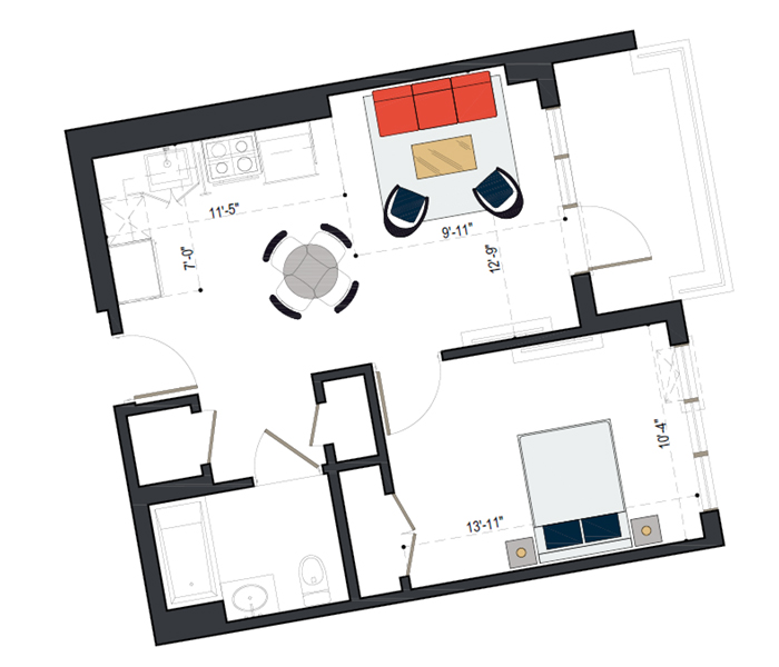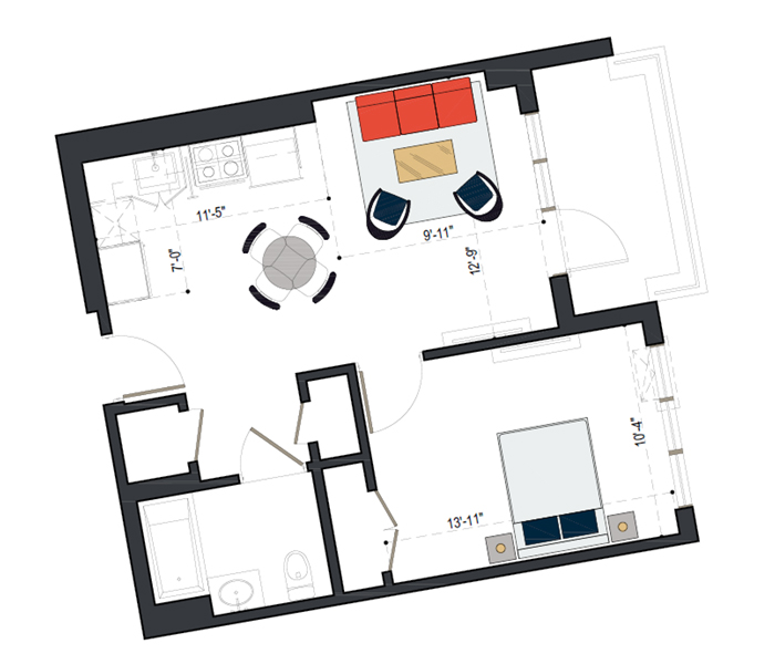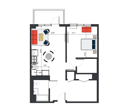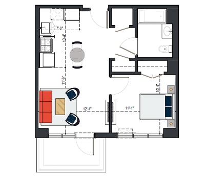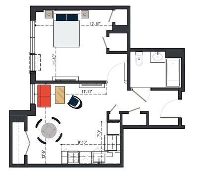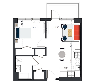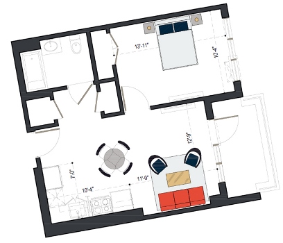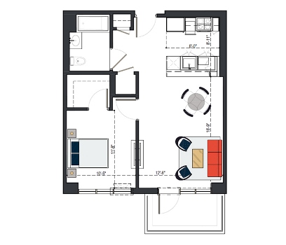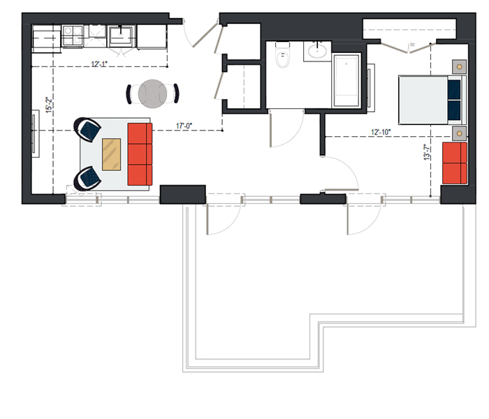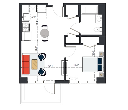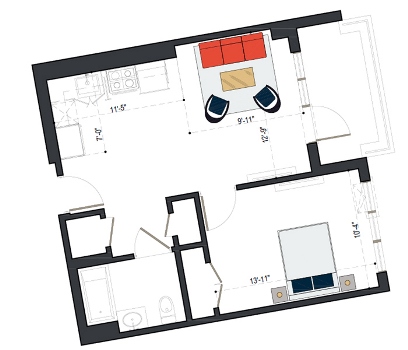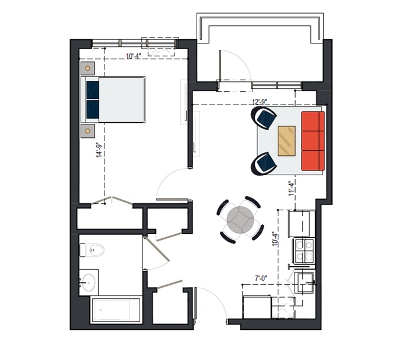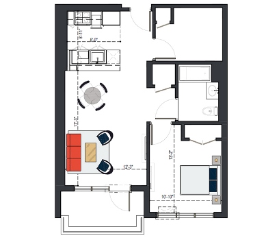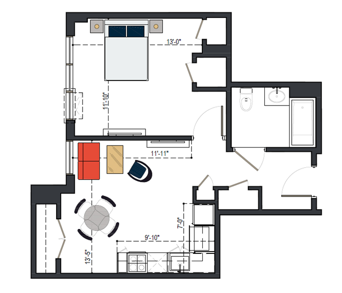 7th Floor, 1 Bed, 545 SF