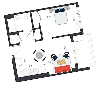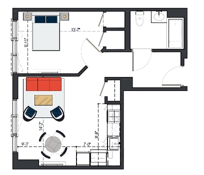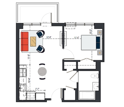 7th Floor, 1 Bed, 557 SF