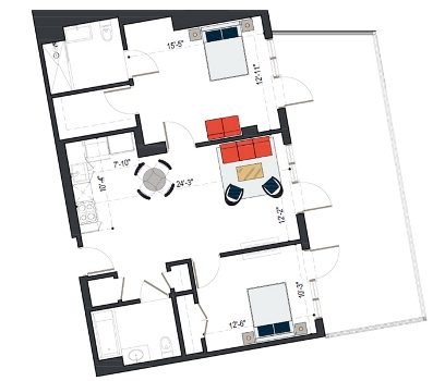 7th Floor, 2 Bed, 824 SF