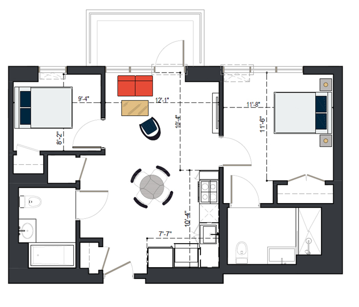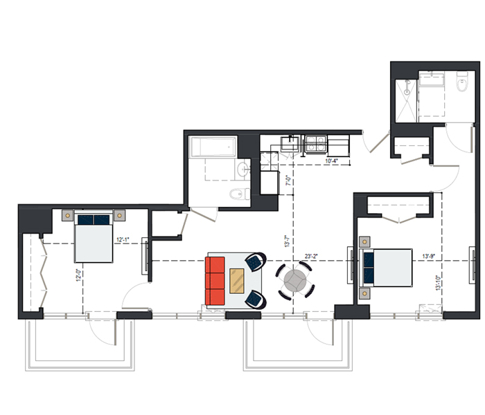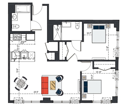 7th Floor, 2 Bed, 871 SF