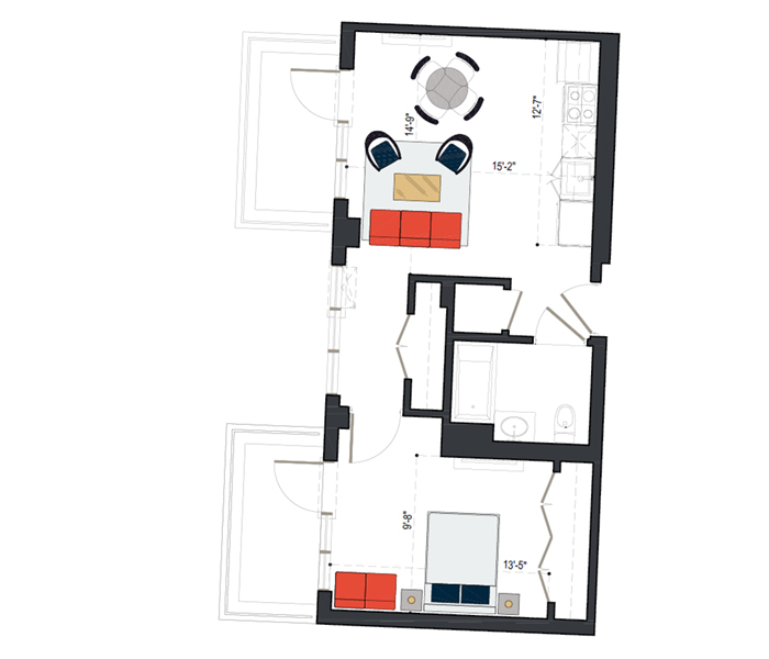 Rheingold’s one bedroom units offer high ceilings and open concept layout perfect for entertaining. Deluxe one beds come with extra square footage and the Premium one beds have a bonus room that can be used as a home office.