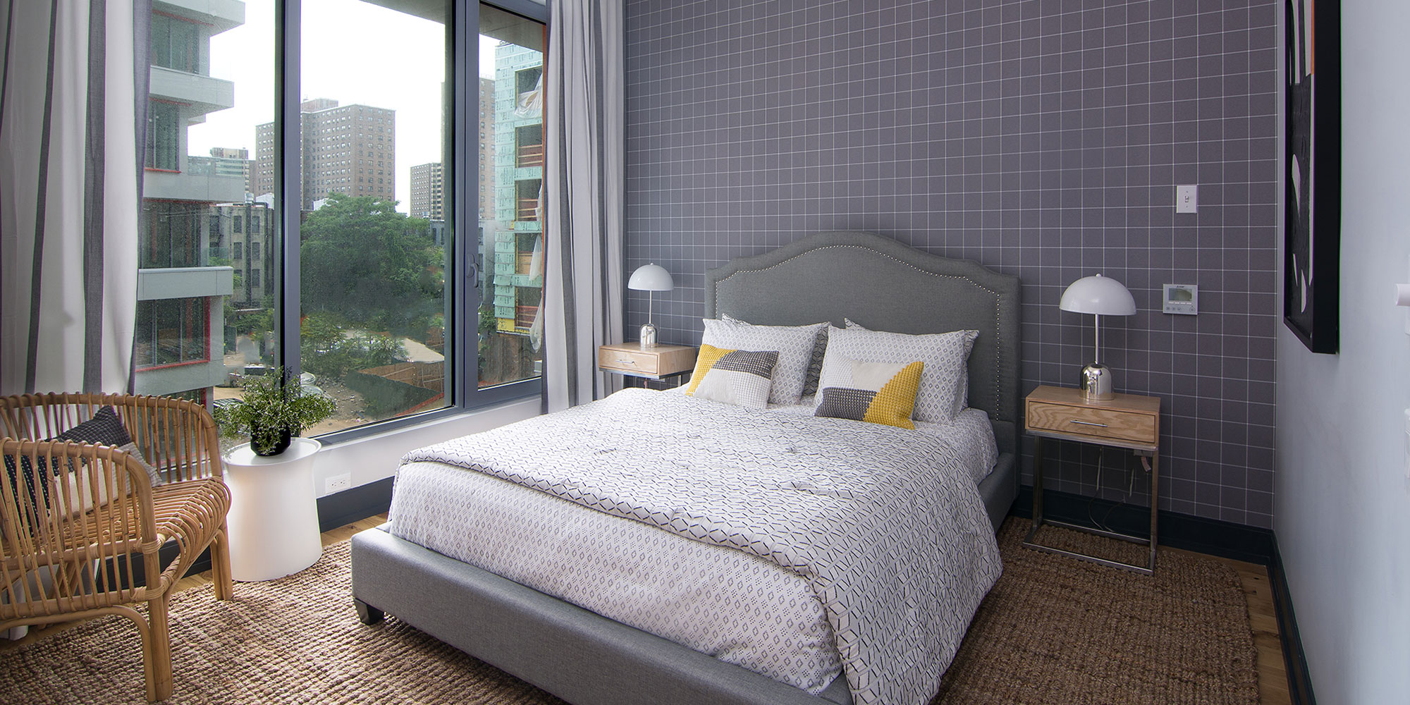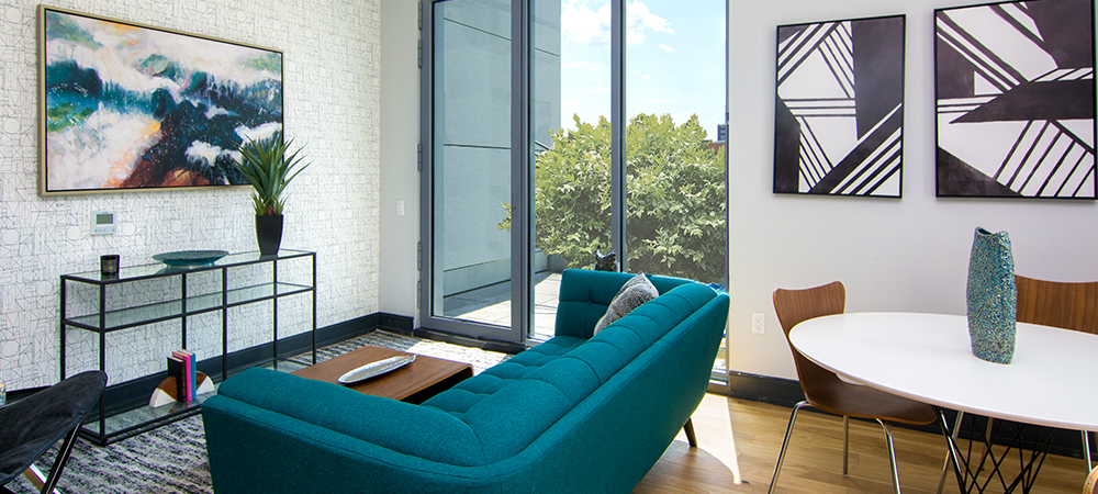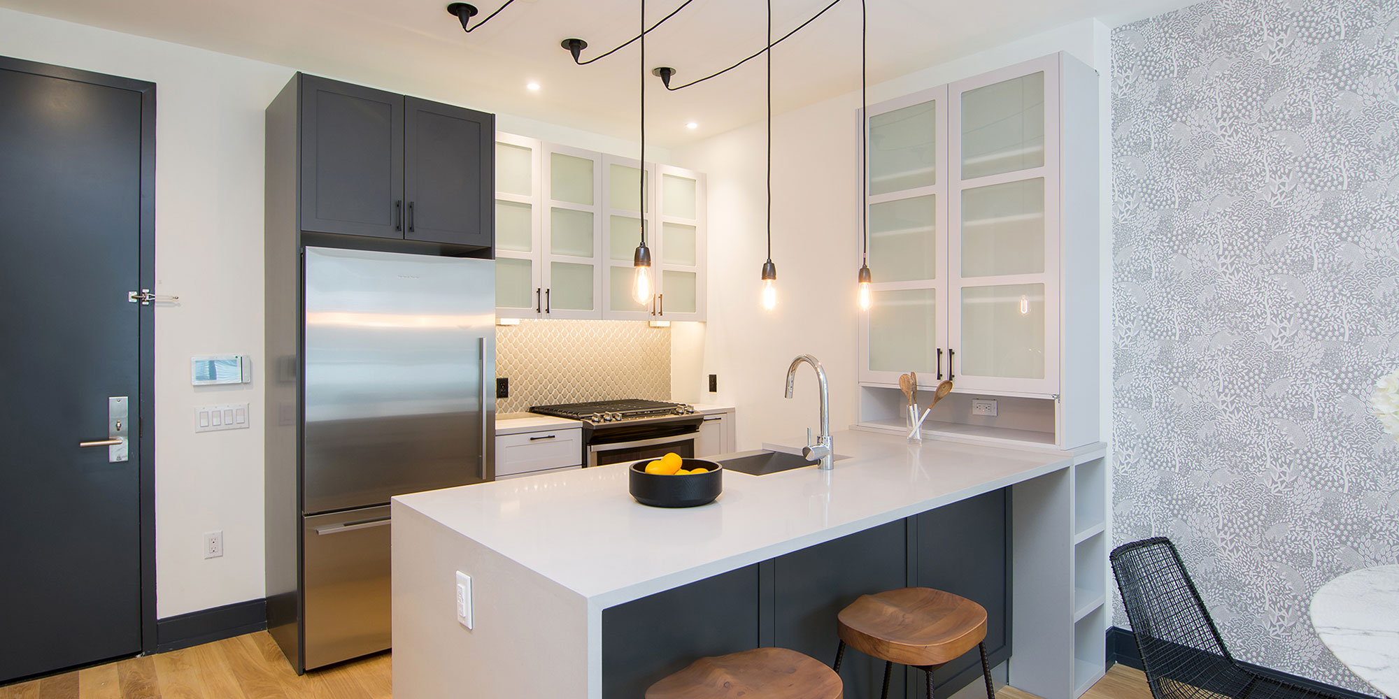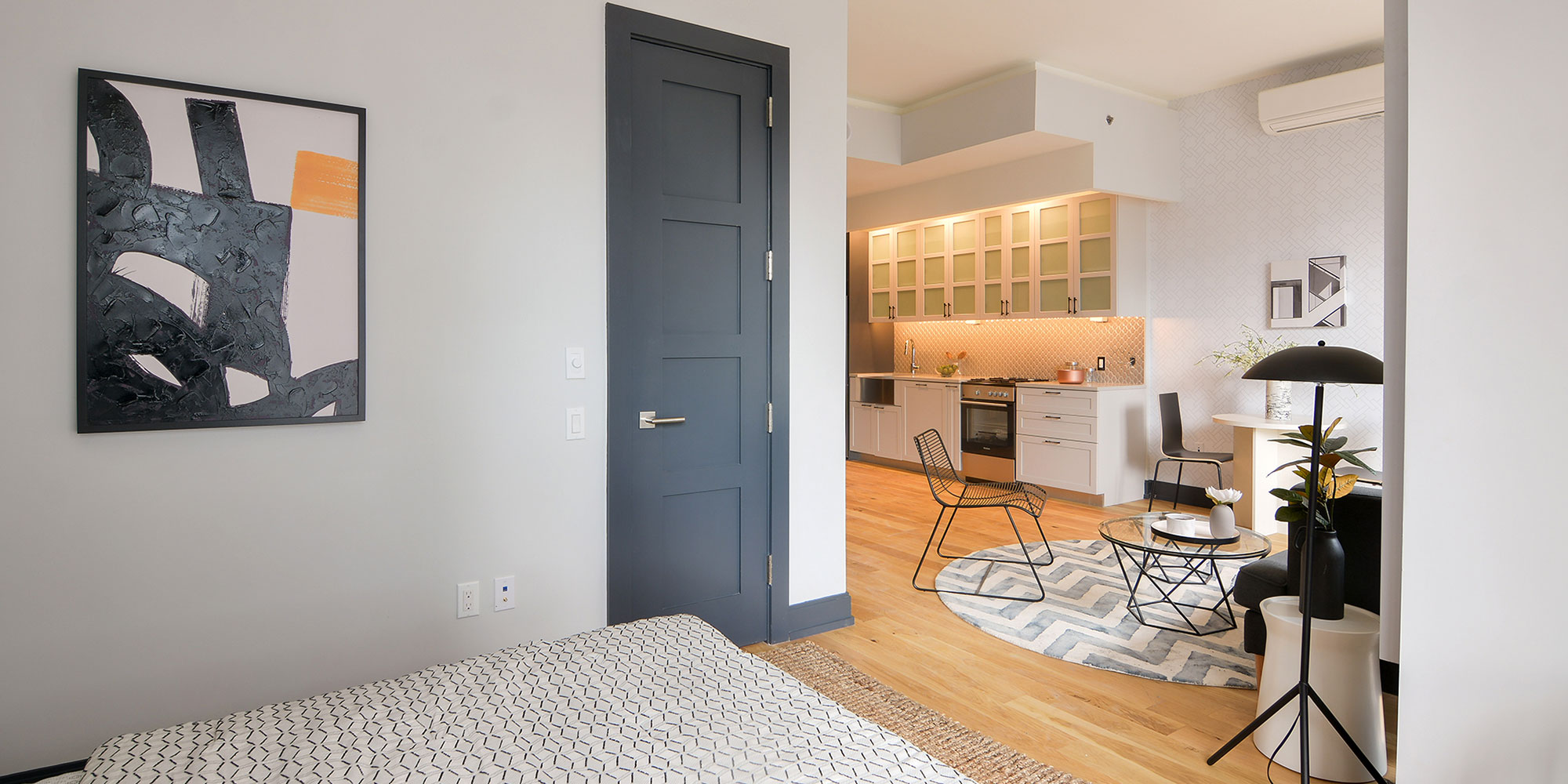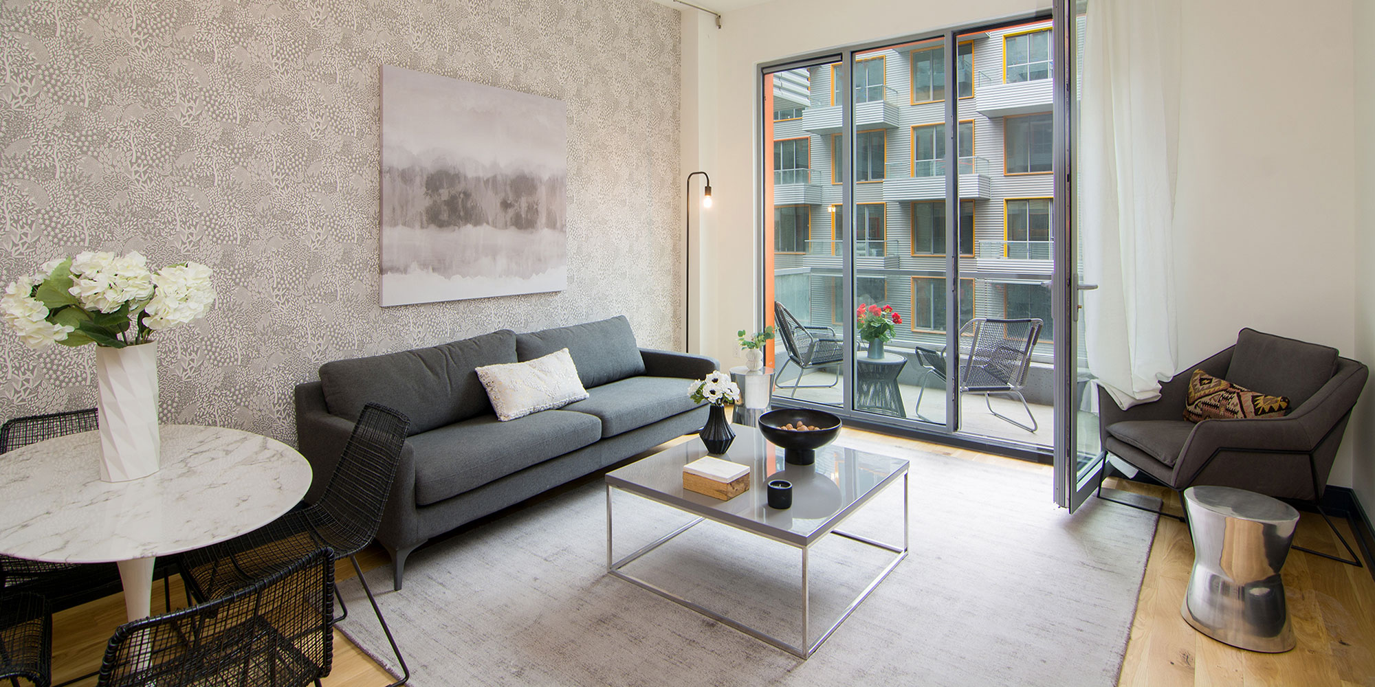 Expansive floor-to-ceiling windows pour sunlight across white oak hardwood floors. The muted interior palette is clean & versatile. Many Rheingold’s residences feature private terraces and balconies.