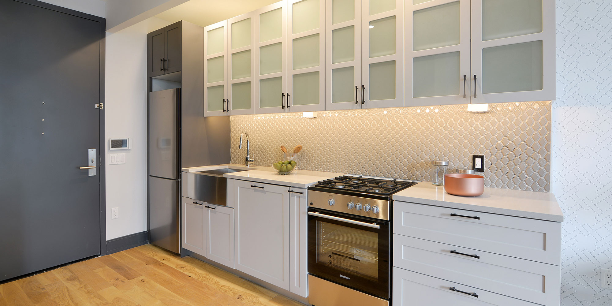 Rheingold’s light, airy kitchens combine a simple, clean aesthetic with sophisticated utilitarian glamour. Soft-close frosted glass cabinetry and sparking porcelain backsplashes complement the classic modern ambience.